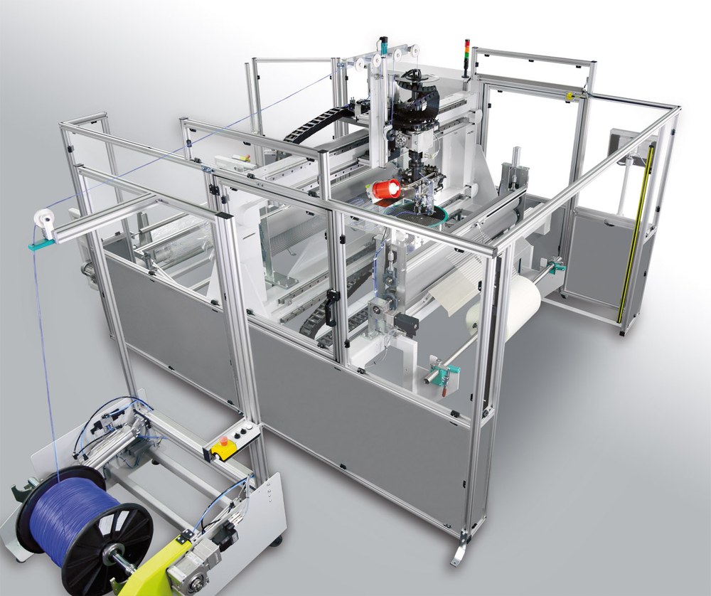 • Fully automatic, autonomous cable/tube laying + sewing (1- or 2-needle chainstitch) with a special laying head. Only the change at the unwinding and winding station is done manually.