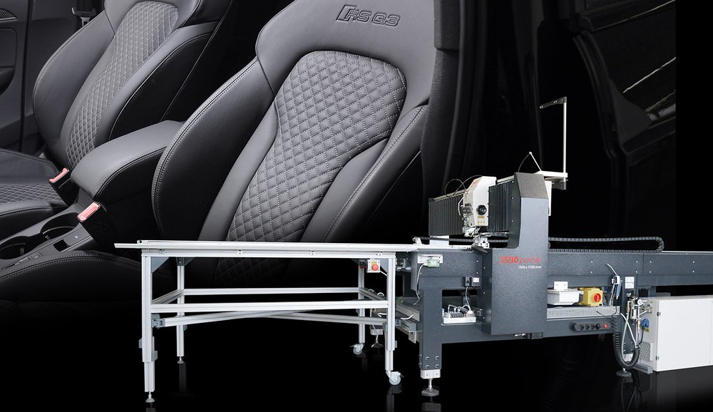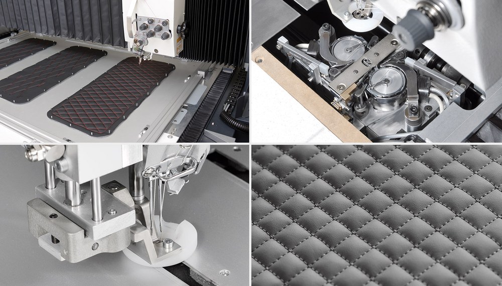 Complex stitching operations in the areas car interior, car seats, airbag production, leather goods, bags, aircraft interior, convertible tops (car). Parallel seams (double-needle version) in y-direction with a needle gauge from 6 to 10 mm