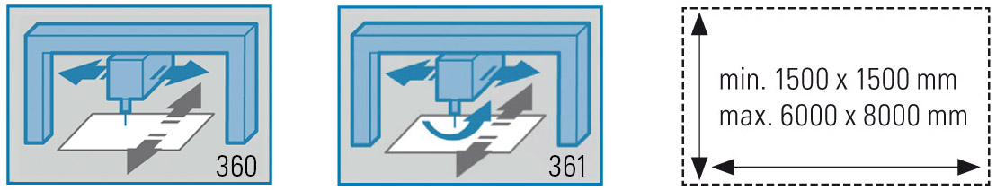 CNC-Nähanlage mit stationärem Nähkopf (360) oder rotierendem Nähkopf (361) und großem Nähfeld (Portal)