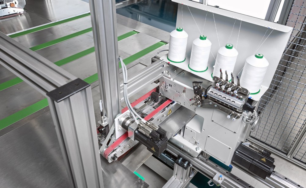 • 4-needle double chainstitch sewing tools as well as needle and top feed with mechanically separated and electronically synchronized needle and looper drive by means of servo motors